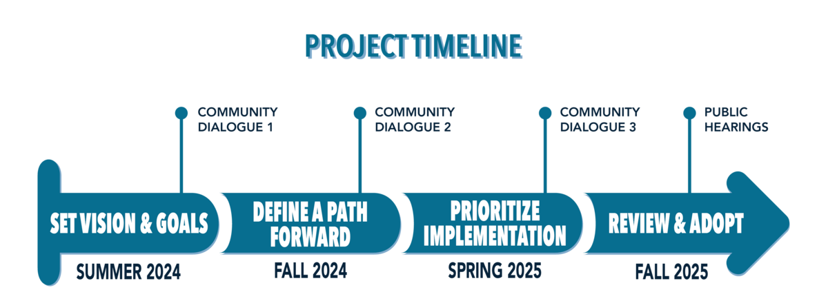 The 2025 Comprehensive Plan planning process will consist of four phases, each with an opportunity for community engagement. During the first phase, we will gather feedback from the community to set the vision and goals. In the second phase, we will define the path forward based on additional community engagement. The third phase will create a road map for implementing the path forward. Finally, in the fourth phase, the plan will be shared with boards and commissions for feedback and approval. This process will take place in the next 14 to 18 months.